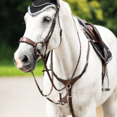 Il s’agit d’une martingale ajustable, équipée d’une légère bouclerie très solide. Ce modèle a été conçu pour être clipsé à l’anneau central de toutes les bricoles Zilco endurance. Les rênes passent au travers des anneaux qui font l’effet d’une martingale.